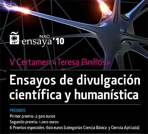 ensayos de divulgación científica y humanística, Ensaya?10, cuya convocatoria hemos abierto recientemente.El certamen Teresa Pinillos está abierto a todos los campos del conocimiento, desde las ciencias experimentales hasta las sociales y humanas. Los trabajos, que tendrán una extensión de entre 1500 y 2500 palabras, pueden versar sobre diversos temas científicos, desde aquellos de orientación divulgativa hasta otros centrados en el análisis crítico de la situación actual de la ciencia. Un jurado formado por profesionales reconocidos de la divulgación científica y el mundo académico evaluará los ensayos de acuerdo a su capacidad divulgativa, calidad literaria e interés social y otorgará un primer premio de 2500 euros y un segundo de 1000, así como varios premios especiales a los mejores ensayos en determinados campos del conocimiento.