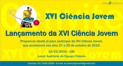A Ciência Jovem, uma das maiores feiras de ciências do Brasil, agora na sua 16a. edição, reune mais de 200 escolas, 10 mil alunos, professores e público em geral. O interessante é que o museu também está completando 16 anos, isso reflete a importância que a feira tem no incentivo e desenvolvimento de pesquisas científicas nas escolas.A Ciência Jovem é a oportunidade para alunos e professores exporem seus trabalhos. As inscrições vão até 15 de setembro e podem ser feitas através do site do Espaço Ciência. A feira ocorrerá nos dias 27 a 29 de outubro. A inscrição é gratuita.