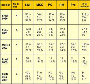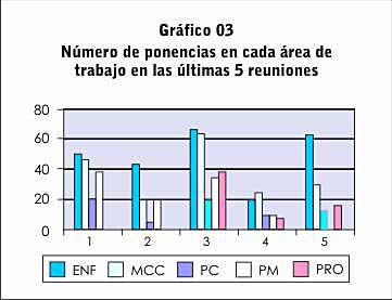 Volviendo al terreno de las Reuniones, de las últimas 5 de ellas se tienen datos que permiten mirar los intereses temáticos de la comunidad de popularizadores y divulgadores de C&T. Como se presentó al inicio de este trabajo las actividades fundamentales en que se centra la acción de los miembros de la Red son Museos y Centros de Ciencia (MCC), Educación No Formal (ENF), Producción de materiales (PM) y Periodismo Científico, (PC). Estos campos de acción se convirtieron en las áreas prioritarias de la Red. Desde León, México, se sumó Profesionalización (PRO), que recoge la necesidad de ir profesionalizando el campo de divulgación y popularización de C&T en nuestros países que ha sido liderado por los colegas de México en especial de SOMEDICyT y Universum. |