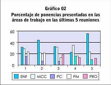 La tabla anterior se puede llevar a gráficos que visualizan las variaciones de las áreas prioritarias y por supuesto de los intereses de los diferentes participantes en las distintas reuniones de la Red. |