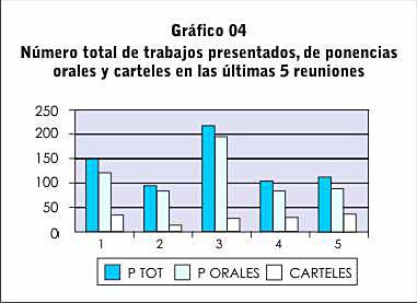 El gráfico 4 muestra que la presentación de ponencias orales es preferida por los asistentes a las Reuniones. En promedio, 1 de cada 5 de los trabajos tienen la presentación en forma de cartel. |