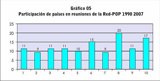 En el gráfico 5 se ve este poder de convocatoria que ha tenido la Red desde sus inicios. A sus reuniones han concurrido personas de 9 a 11 países y en la 6ta., 7ma. y 10ma. Reunión la presencia de personas venidas de países fuera de la región ha sido significativa y es indicio de la presencia internacional de la Red que tiene Miembros Asociados en Europa y Estados Unidos. Por ejemplo, durante la VIII Reunión en León, México, se congregó el International Programm Committee, IPC, en una de las reuniones preparatorias del IV Congreso Mundial de Museos y Centros de C&T que se llevó a cabo en Río de Janeiro en 2005. Los diferentes miembros del IPC, también participaron en la 8va. Reunión. Como dato curioso en la 1ra. Reunión participaron dos personas de fuera de nuestra región, una de España y otra de Estados Unidos. |