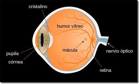 Retina: El recubrimiento posterior de dos tercios del ojo. Es la pantalla que recibe la imágenes y las convierte en impulsos eléctricos que son llevados por el Nervio Óptico hasta el cerebro.