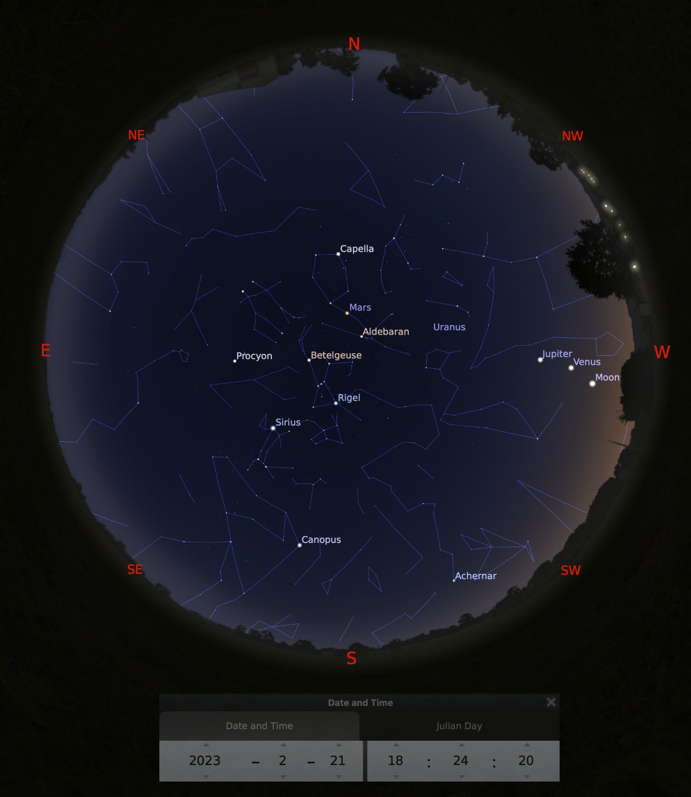 Mapas del cielo sobre Costa Rica creados con Stellarium indican la hora y el día abajo.
