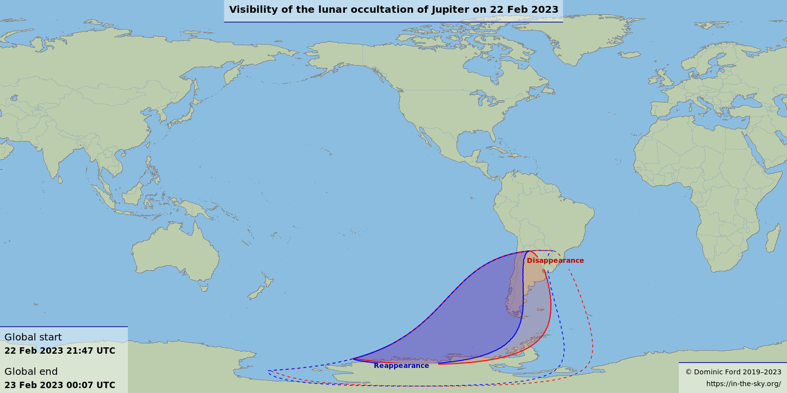 Mientras que para Costa Rica el 22 de Feb. solo se acercan visualmente, La Luna y Júpiter, para el extremo sur de Sudamérica la Luna oculta el planeta, como sucedió en enero desde nuestro país cuando la Luna ocultó a Marte.