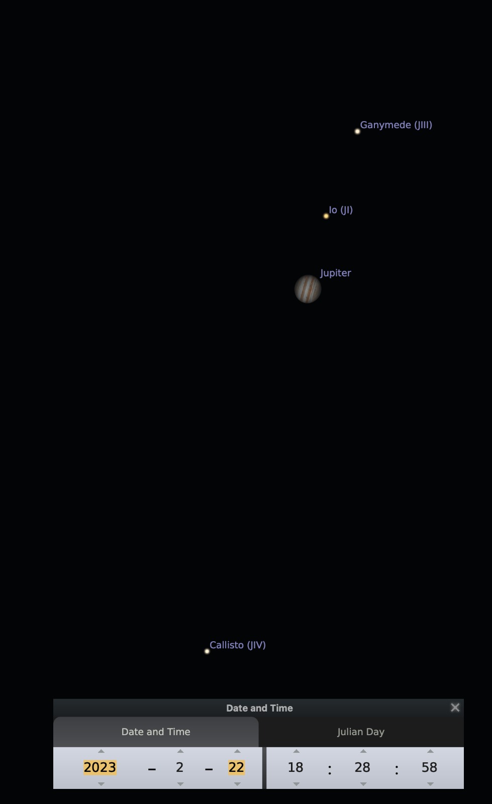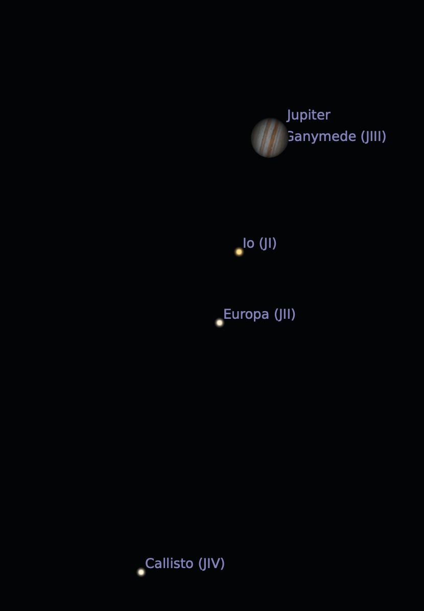 Júpiter es un gran objeto para telescopio porque se pueden ver sus "lunas" más grandes en su cercanía. A veces se pueden ver las 4 llamadas lunas galileanas, porque fueron descubiertas por Galileo Galilei. Otras veces solo se ven dos o tres, porque el planta o alguna luna está eclipsando a la otra y la oculta. Además, durante período largo de observación, se pueden ver las lunas cambiar de posición respecto al planeta, como lo muestran las dos imágenes que siguen.