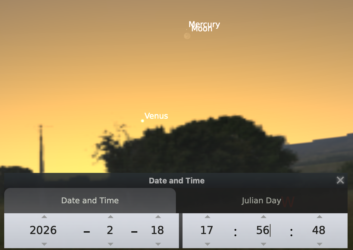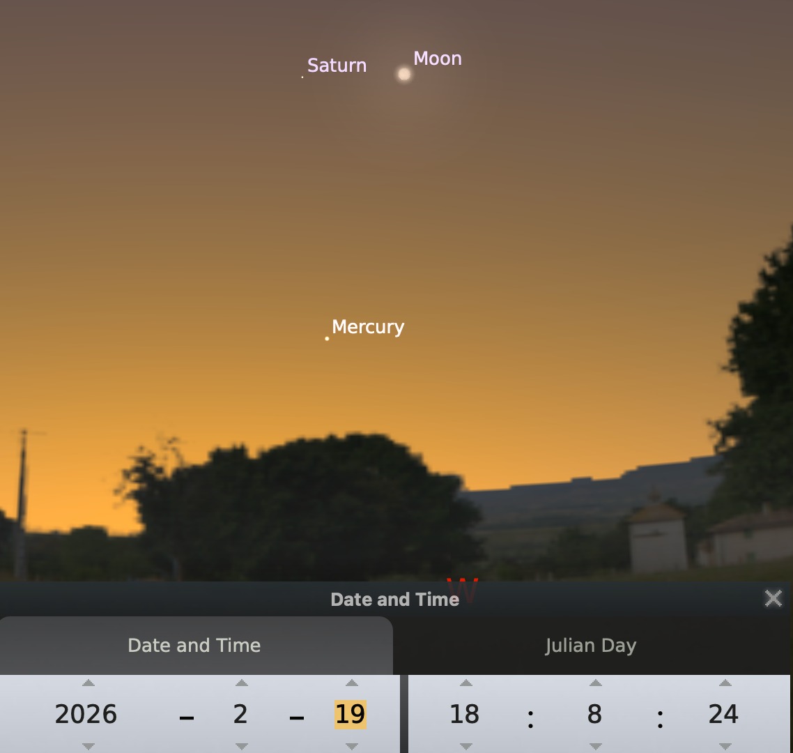 - Mercurio, Cachito de Luna (de 1.4 días) y Venus al oeste después del atardecer. Todos se encuentran en Acuario.