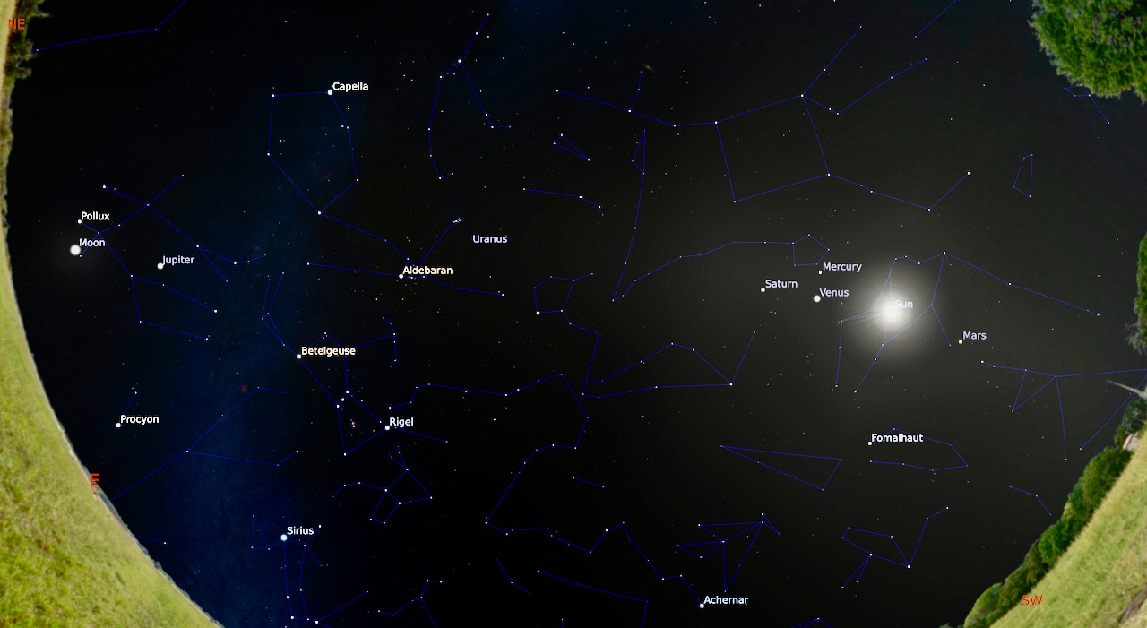Júpiter alto en Gemini, seguido de Urano, más bajo Saturno, Neptuno, y Mercurio y Venus en el destello del Sol, (los cuatro últimos en Pisces).