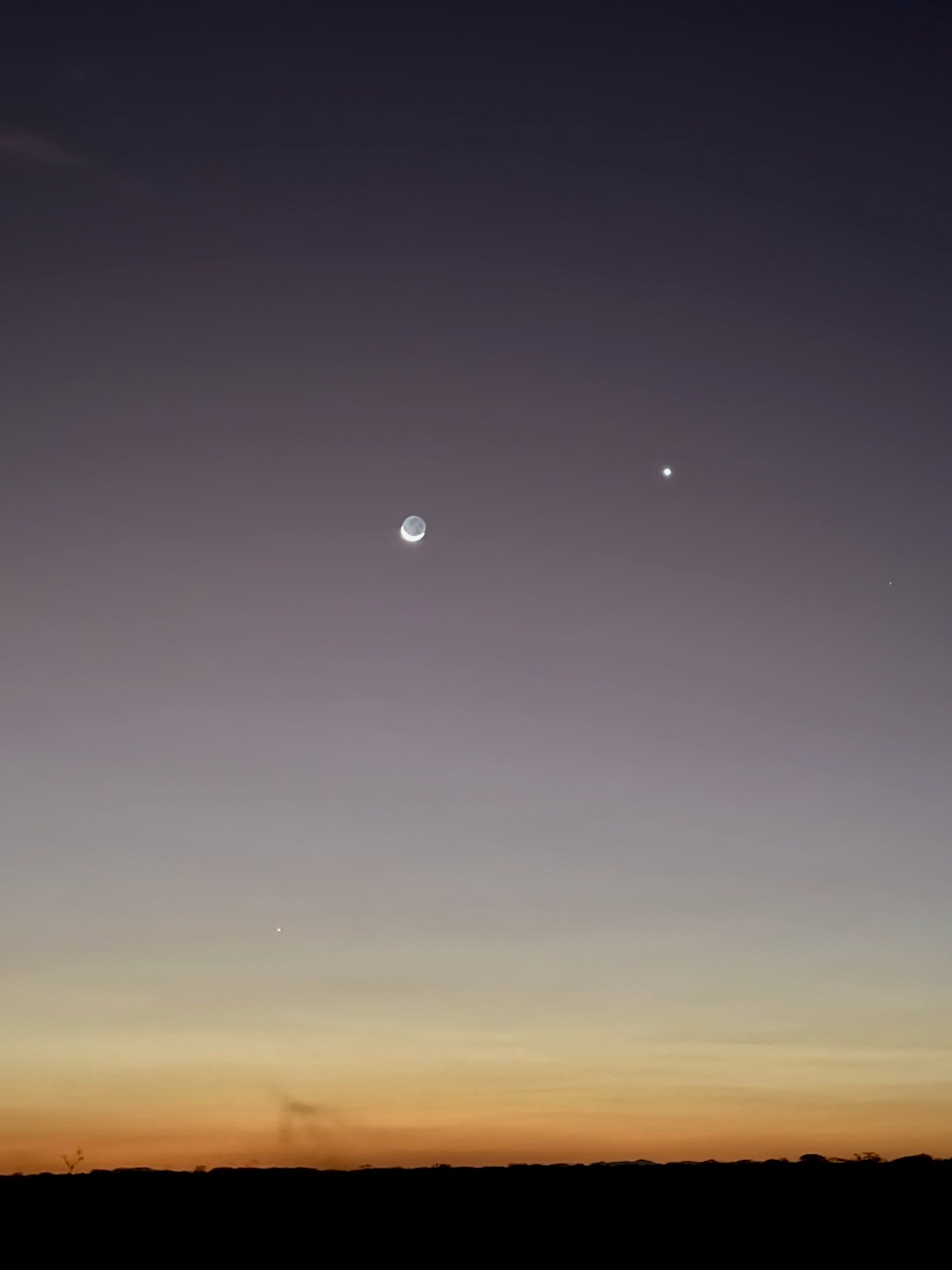 El cachito de Luna puede ser una buena guía. Después de que el sol se ha puesto, se pueden usar binoculares para patrullar el cielo oeste. (Nunca ver el sol directo o con binoculares porque se quema la retina).