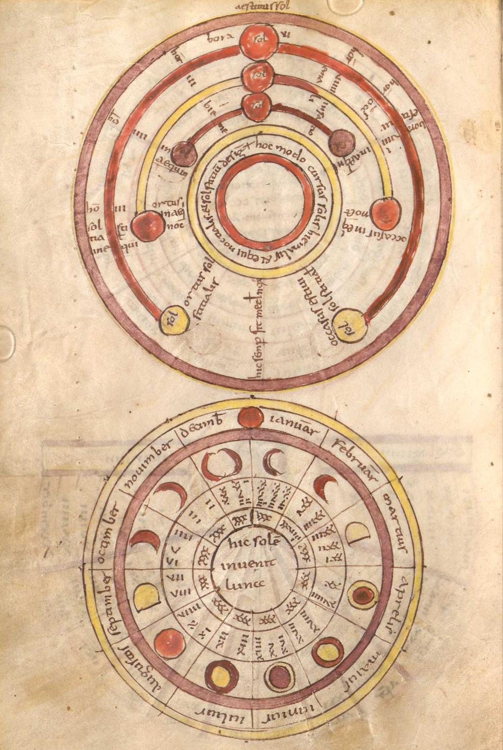 Cálculo del ciclo metódico de 19 años con dos ruedas (arriba la solar y abajo la lunar), tomado del manuscrito hecho en el Monasterio St. Emmeram (Clm 14456, fol. 71r). Fuente: Wikipedia.