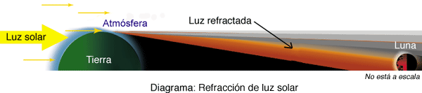 Si no existiera la atmósfera terrestre, durante el eclipse, la Luna desaparecería ante nuestros ojos, no podríamos verla del todo. Pero en la realidad, la Luna se torna rojiza debido a la refracción causada por la atmósfera.