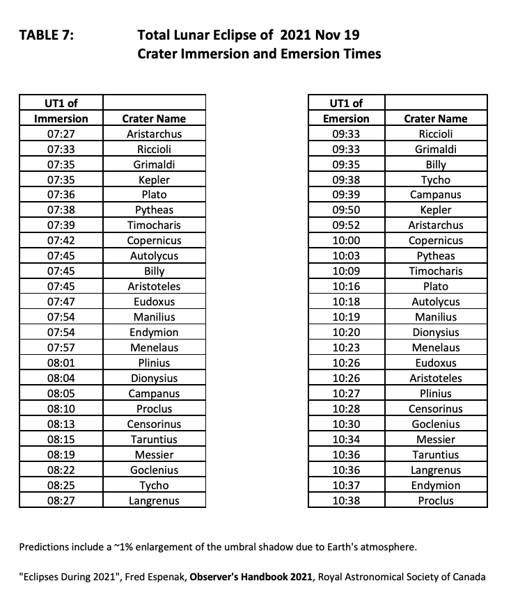 Aquí podrá encontrar una tabla de tiempos de inmersión de cráteres en la sombra oscura de la Tierra de este eclipse. Para la gente aficionada, estos tiempos pueden servir como retos visuales, a simple vista, con binoculares o telescopios, para seguir el movimiento de los astros. Para los astrónomos, estas proyecciones se ayudan a confirmar el tamaño exacto de la sombra en el eclipse.