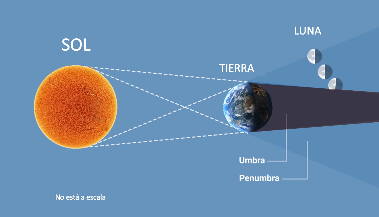 En este eclipse lunar, el Sol se encuentra en un extremo, la Tierra en medio y la Luna al final.