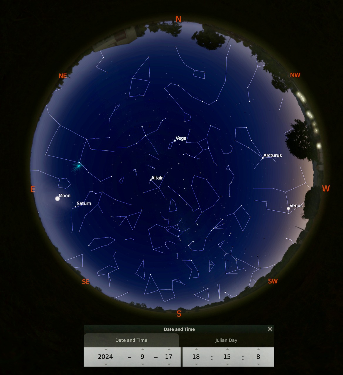 La Luna tiene de fondo la constelación de Piscis y está precedida por el planeta Saturno. Saturno sale desde las 16:58, es brillante y amarillito, se encuentra sobre el fondo estrellado de Acuario, la constelación vecina de Piscis. Durante la noche, los dos seguirán juntos, cruzando el cielo de este a oeste.