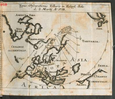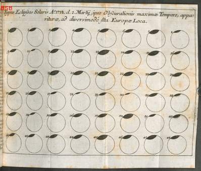 Las más antiguas publicaciones de la historia. Este mapa y la secuencia solar son del eclipse parcial de sol que cruzó el norte de Europa el 2 de marzo del 1718. Las imágenes fueron publicadas en el Almanaque de bolsillo de Johannes Gaupp (1667-1738) de Lindau y están digitalizadas en la Biblioteca Estatal de Baviera, Alemania.