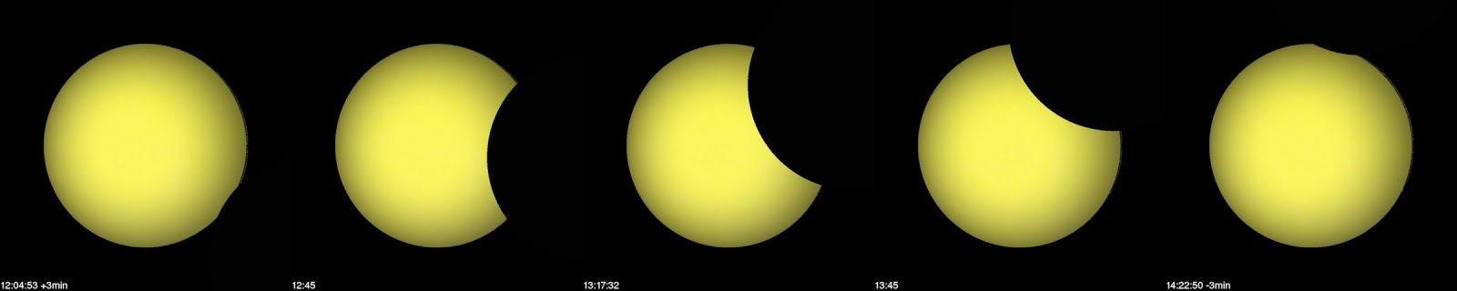 - Fin del Eclipse: 14:22:51 altitud = 49,9 ° acimut = 276,6° (Oeste).