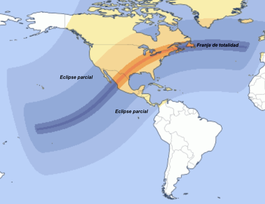 El lunes 8 de abril, se dará un Eclipse Solar en la región, que para Costa Rica será parcial y para una franja central de la sombra será Total. Esta angosta banda de totalidad cruza México, Estados Unidos y Canadá, y allí la Luna cubrirá totalmente el disco solar.