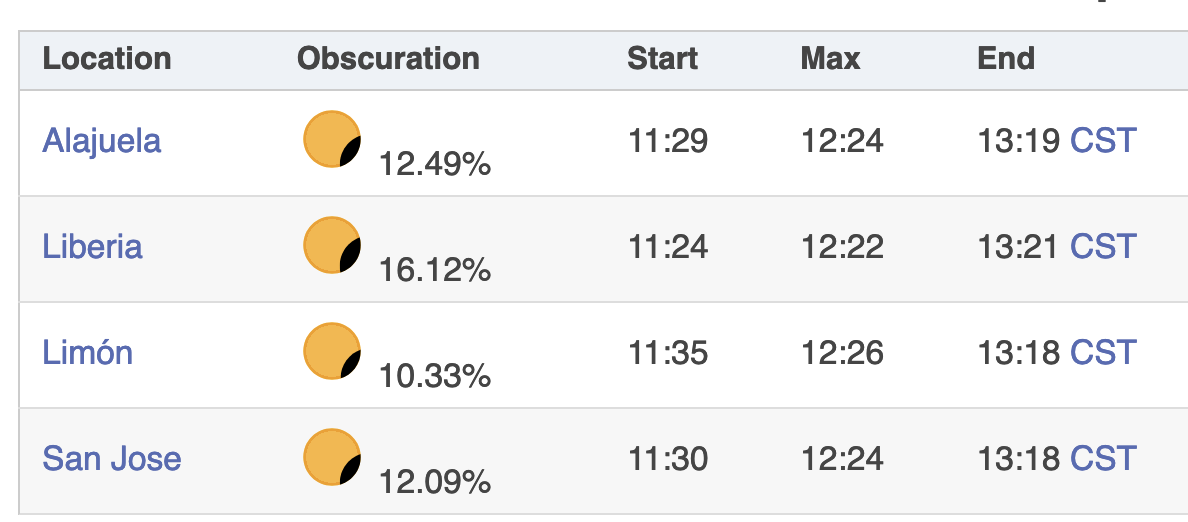 En esta alineación de los tres astros, Sol, Luna y Tierra, Costa Rica se encuentra en un borde de la sombra, por lo que el oscurecimiento del disco solar será entre un 16% a un 12%. Sin embargo, en nuestra región el "mordisco" de Sol será lento y tomará varias horas para llegar al máximo.