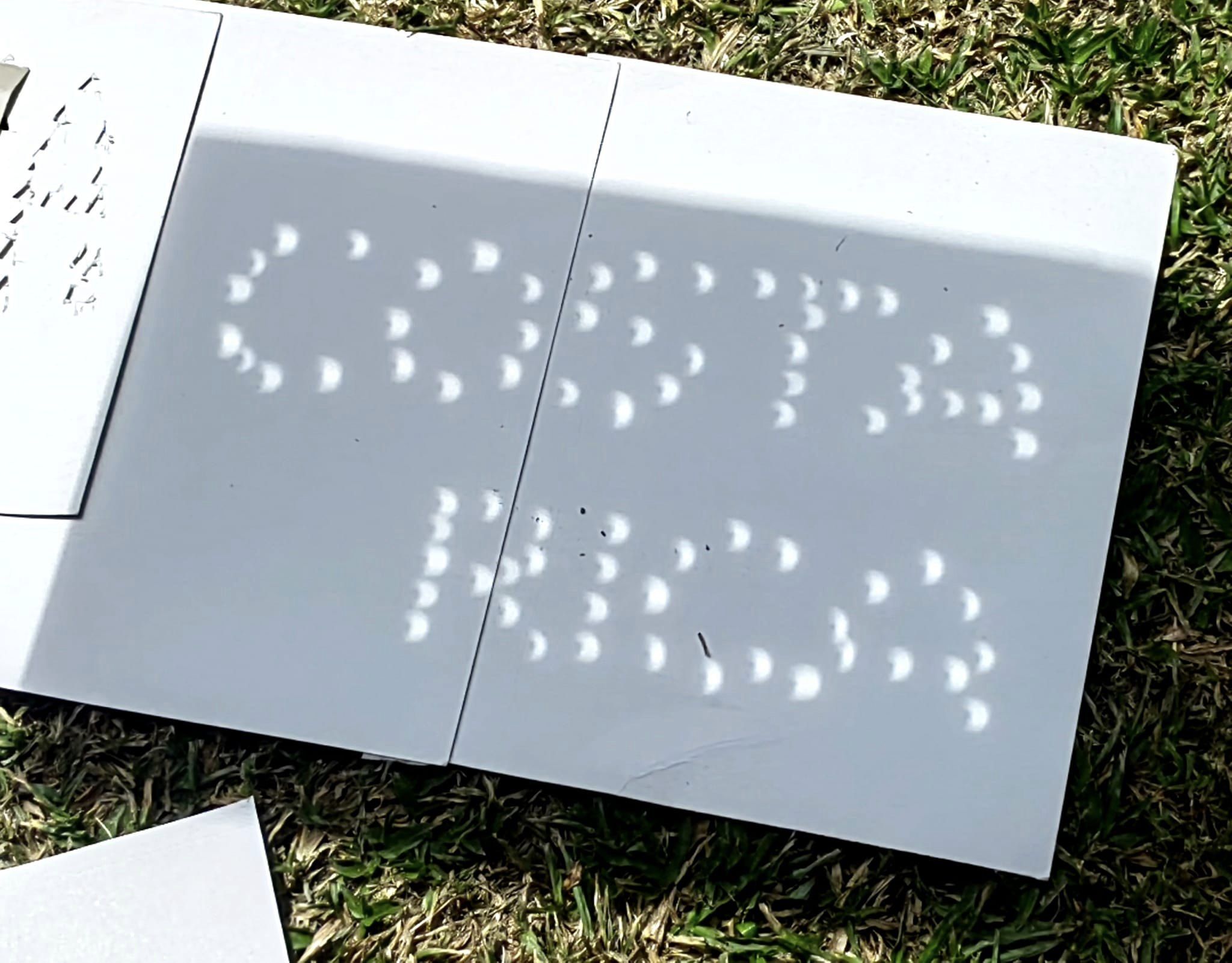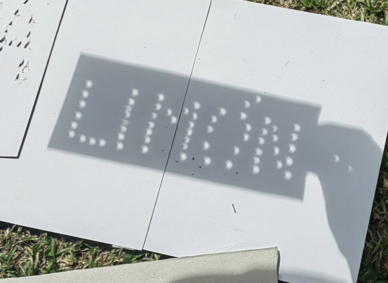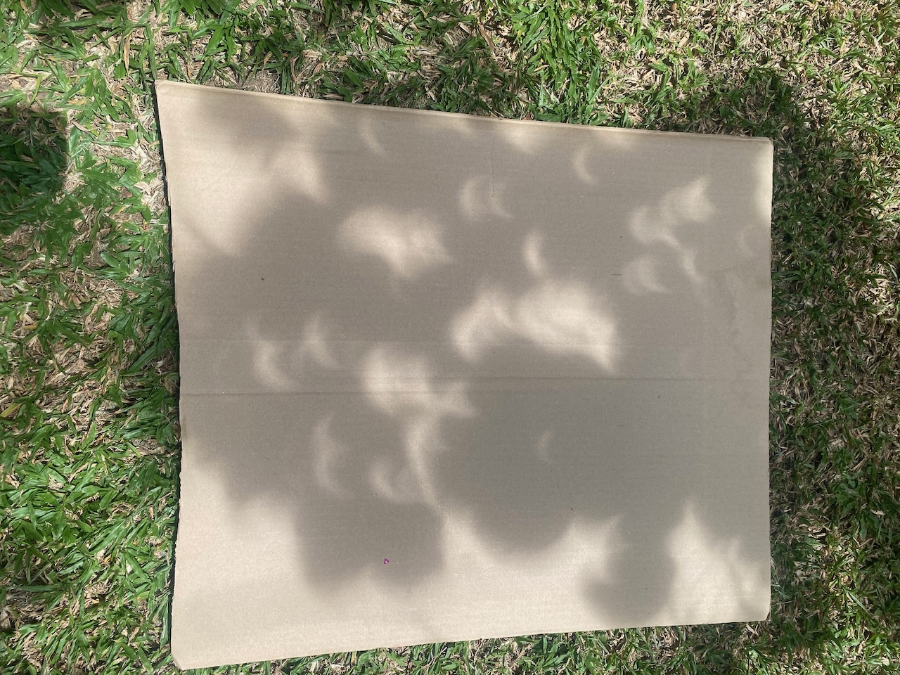 Si no tienen filtros seguros para ver el Eclipse directamente, pueden observar las proyecciones del Sol a través de huequitos. Estos se producen siempre y conservan la forma de la fuente de luz, el Sol. Se encuentran fácilmente debajo de los árboles cuando la luz solar pasa a través de pequeños espacios entre sus ramas.