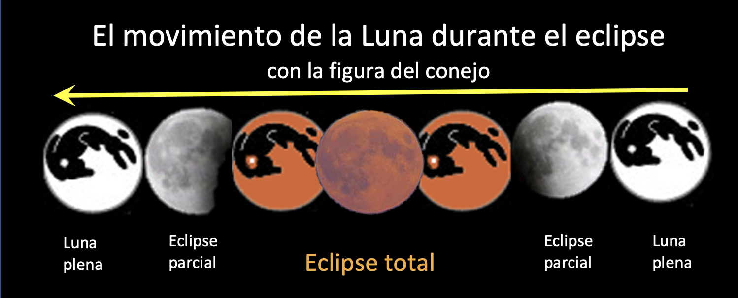 A continuación encontrará un esquema general de un Eclipse total de Luna. Utiliza la figura del "conejo" para aydar a identificar la dirección y posición de la Luna al entrar y salir de la sombra terrestre. Por ejemplo, en la fase parcial de entrada del eclipse, lo último en introducirse en la sombra son las "orejas del conejo". También se puede notar fácilmente que al salir la Luna el conejo está centado y al acostarse en la madrugada, está de cabeza.