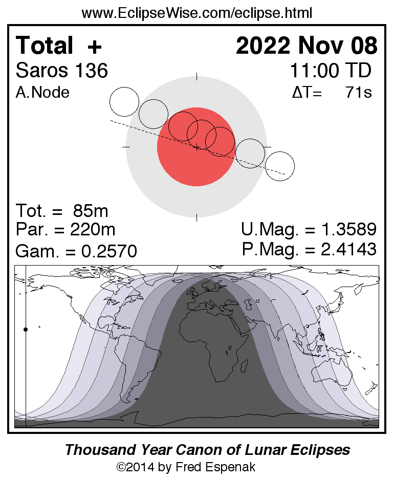 Eclipses hermanos. Este eclipse lunar está precedido por uno solar parcial ocurrido dos semanas antes, el 25 de Oct. 2022, que fue visible en África del norte y partes de Europa y Asia. Estos dos eclipses suceden en una misma temporada de eclipses. Estas temporadas duran aproximadamente 25 días y pueden presentar entre 2 a 3 eclipses. Suceden cuando el Sol, la Tierra y la Luna se alínean aprox. cada 6 meses y la Luna está en uno de los nodos (su órbita alrededor de la Tierra intersecta la eclíptica).