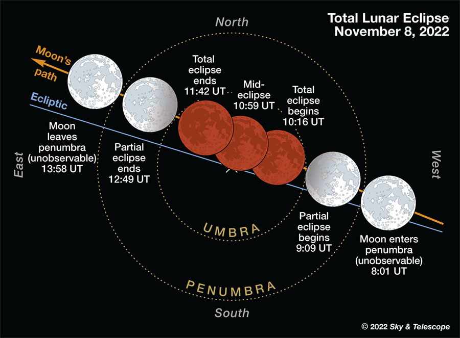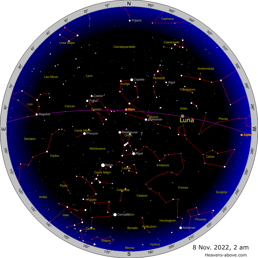 Desde nuestro país, la madrugada del 8 de noviembre 2022 se podrá observar un Eclipse total de Luna. La Luna llena de noviembre cruzará el cielo enmarcada entre Marte (al este) y Júpiter (al oeste). En horas de la madrugada, jugará a esconderse en la sombra terrestre.