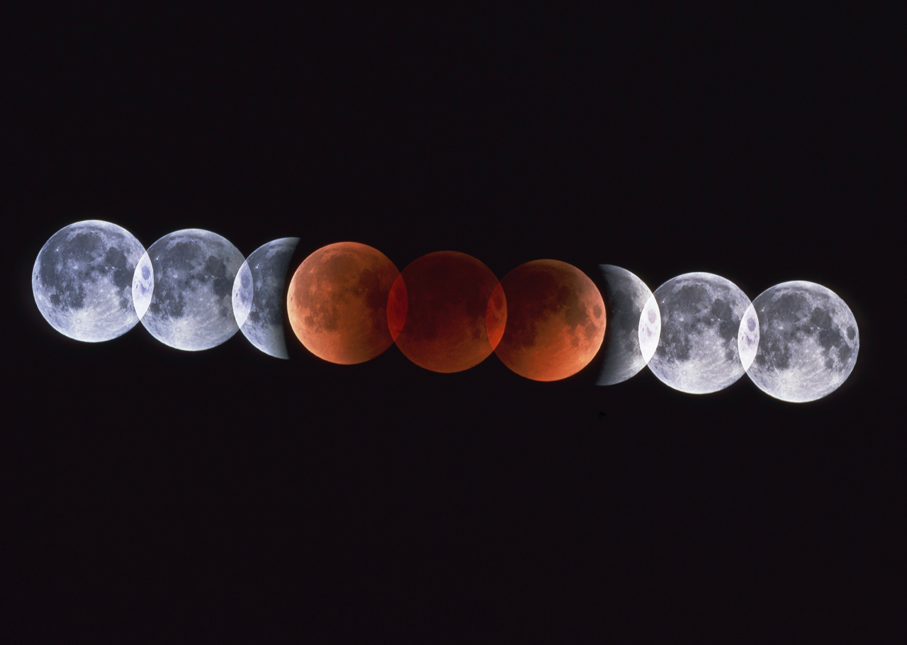 La Luna se interna en la sombra de la Tierra y, al hacerlo, se torna rojiza. En ese momento el cielo se oscurece y se ven las estrellas tenues de nuevo.
