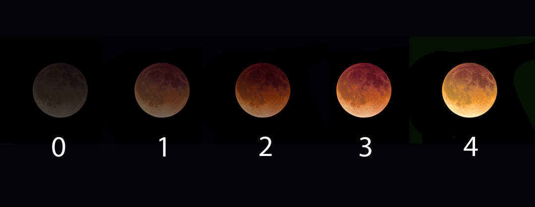 - L=2 Eclipse rojo profundo o color de óxido. La sombra umbral central muy oscura, mientras que el borde de la umbra es relativamente claro.