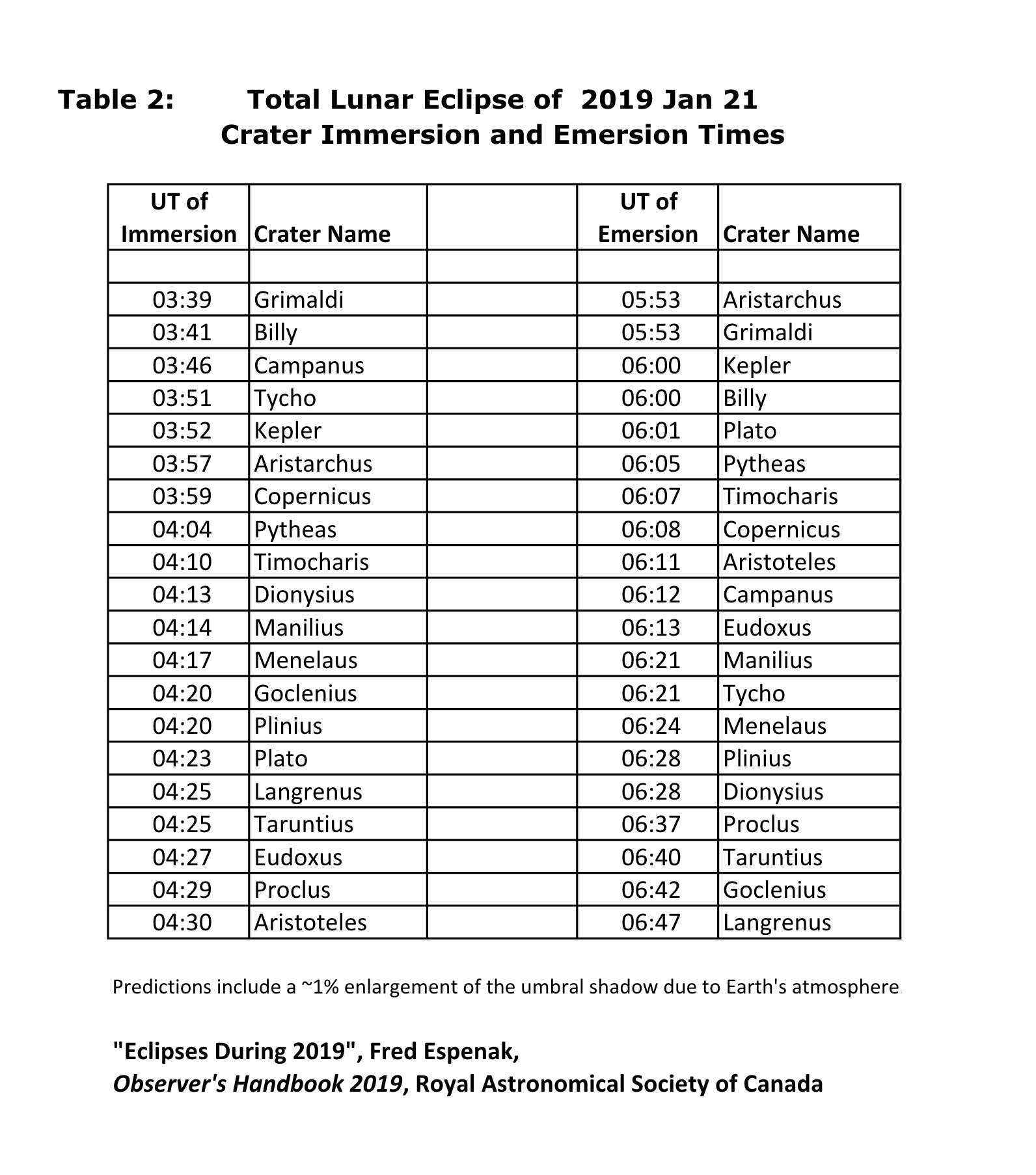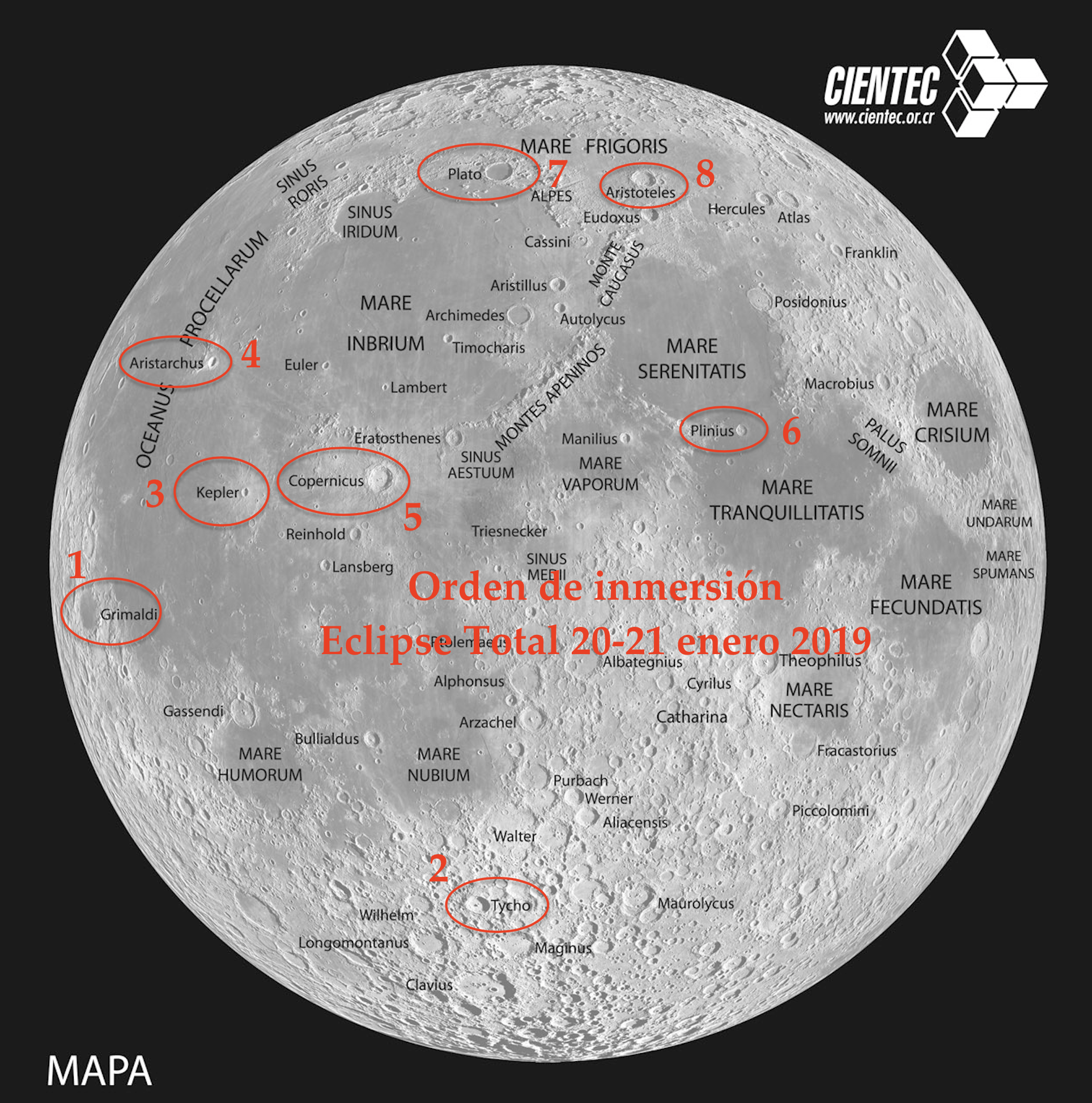 Busque sus binoculares y participe. Escoja un crater y cronometre su ingreso (completo) a la sombra oscura (umbra) de la Tierra, en el Eclipse Total de Luna del 20-21 de enero 2019. Estamos hablando de la fase parcial inicial del Eclipse. Participe en este juego y aprenda de la superficie lunar. La tabla adjunta es la estimación realizada por Fred Espenak (ahora pensionado de la NASA),con las horas en UT (para Costa Rica hay que restar 6 horas). ¿Cuál crater quiere seguir? Los hemos numerado en orden de inmersión, de acuerdo a la tabla, para que escoja.