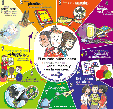 Por lo anterior, la secuencia de pasos sugerida aquí no debe verse como una “camisa de fuerza”. Por ejemplo, una persona puede iniciar una investigación a partir de una reflexión con otras personas (paso 7), en la que se genera una pregunta guía (paso 2) o una hipótesis que interesa (paso 3), luego pasa a observar y busca patrones (paso 1), recoge algunos datos (paso 4) y realiza unos experimentos o modelos (paso 8). Entonces tiene suficiente información como para PLANIFICAR una investigación (paso 3). Podría realizar más experimentos, modelos (paso 8) u observaciones (paso 1); organizar la información obtenida (paso 6), buscar otras fuentes confiables sobre el tema (paso 5), sintetizar y extrapolar sus resultados, para encontrar los límites en los que es aplicable (paso 9), y concluir comunicando la investigación a otros (paso 10).
