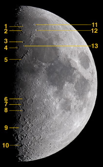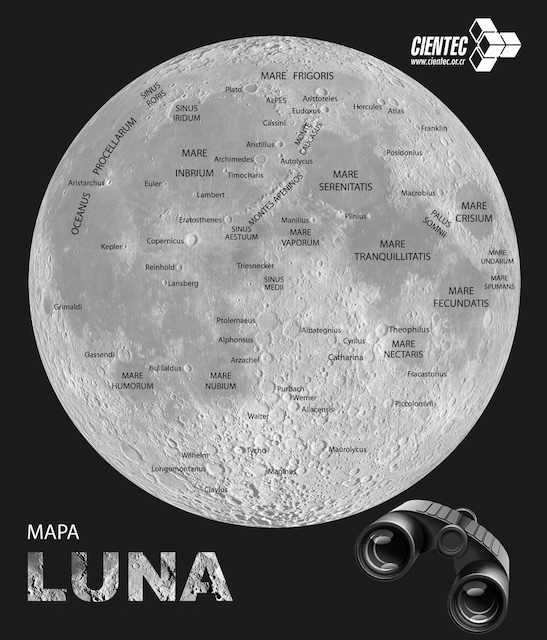 Cráteres, valles, montañas y grandes honduras son visibles con binoculares o telescopio.