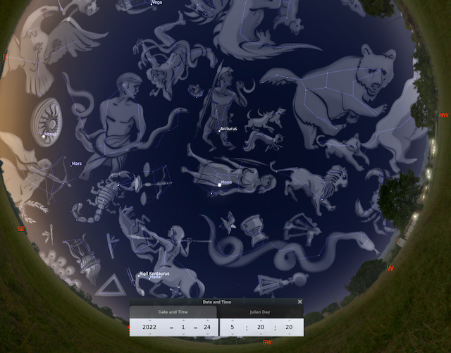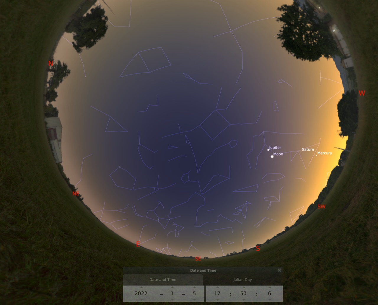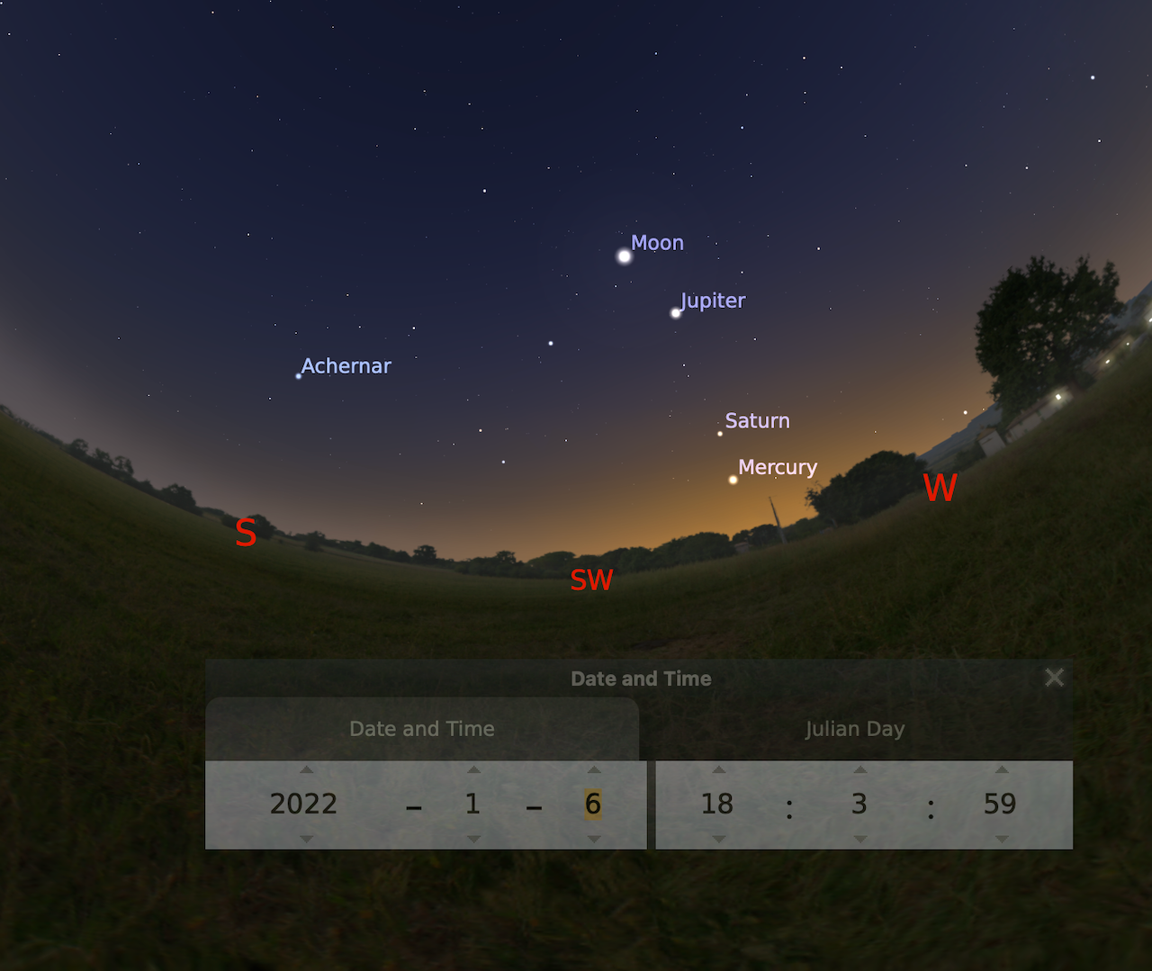 La imagen muestra la fecha y hora aproximada del evento. La dirección está indicado en el horizonte del mapa. Imagen: Stellarium