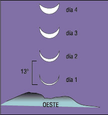 Si busca la Luna a la misma hora, notará que la Luna se desplaza todos los días hacia el ESTE, aprox. 13 grados. Este desplazamiento servirá para conocer otros objetos cercanos a la eclíptica. Más sobre "Dimensiones y patrones para medir el cielo".