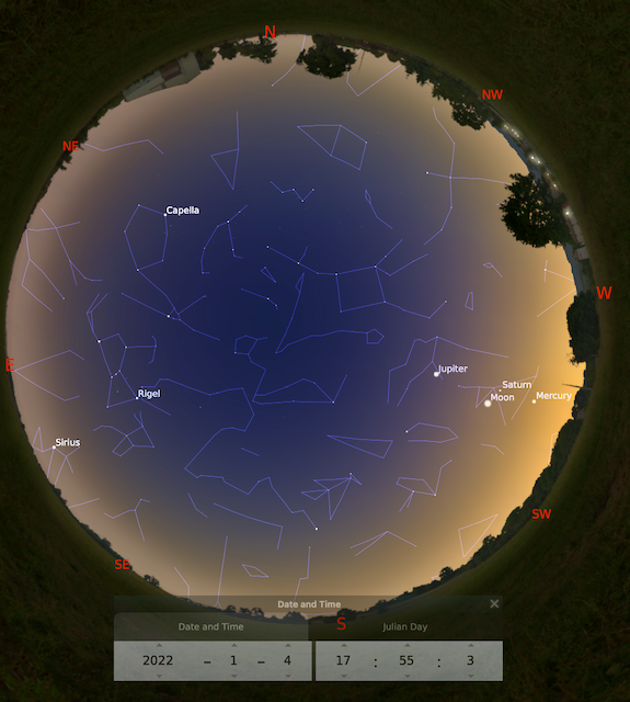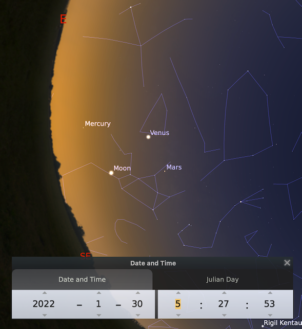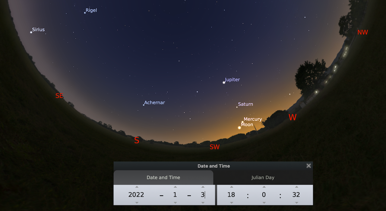 6 enero- Planetas y Luna en fila, Mercurio, Saturno, Júpiter y Luna creciente.