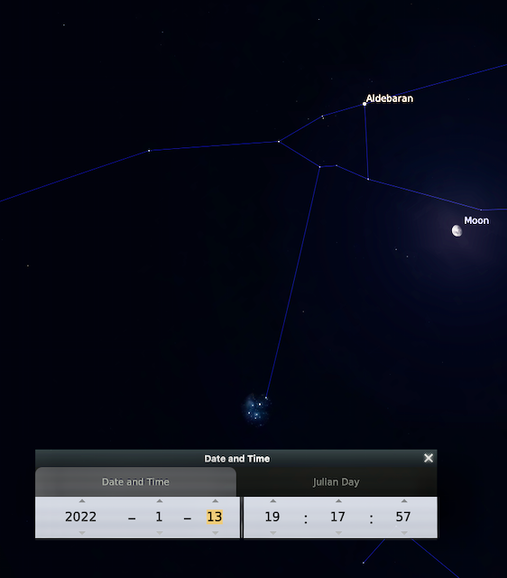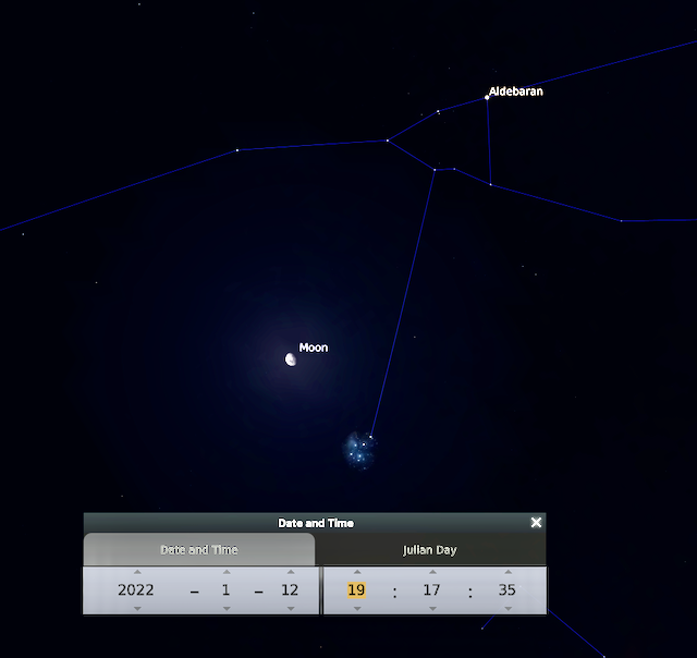 13 enero- La Luna esta cerca de Aldebarán la estrella más brillante de Tauroel cúmulo de las Hyades (en la carita del toro).