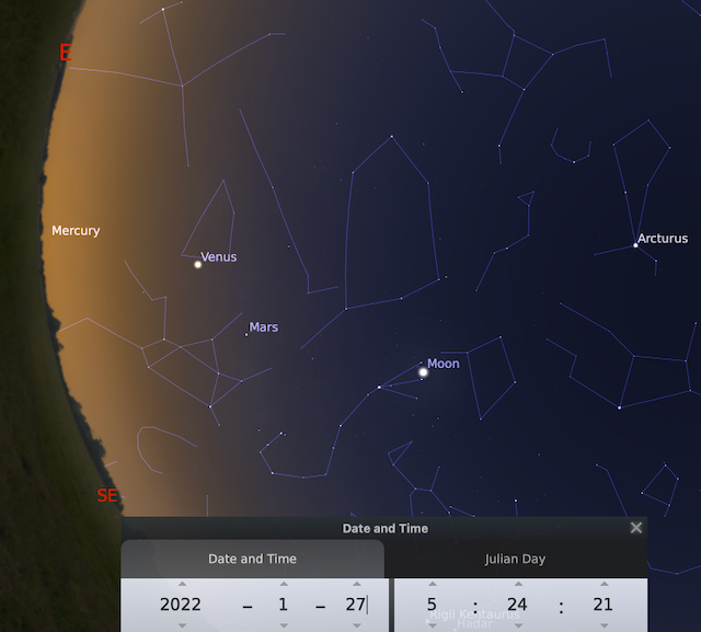 6 enero - Mercurio en mayor elongación Este (máxima distancia angular entre el Sol y Mercurio). Favorece la observación a simple vista de este planeta que siempre está muy cerca del Sol y por ello es más difícil localizar.
