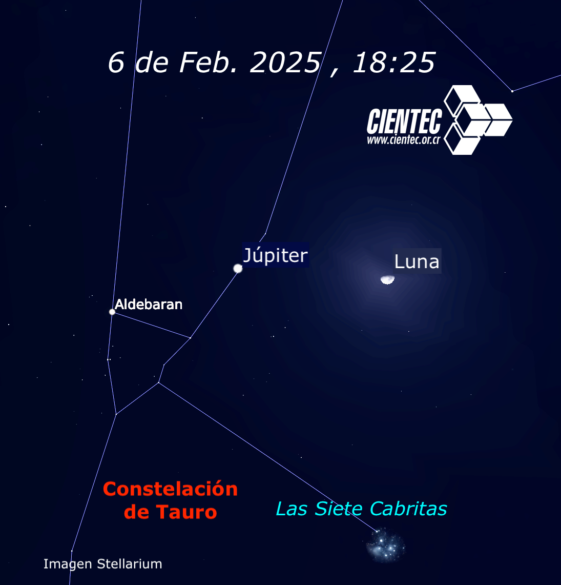 La Luna y el planeta Júpiter alcanzan su mayor cercanía a las 20:01 (hora de CR) y pasan 5°25' uno del otro. La Luna y Júpiter están en Tauro y la Luna está de 9 días.