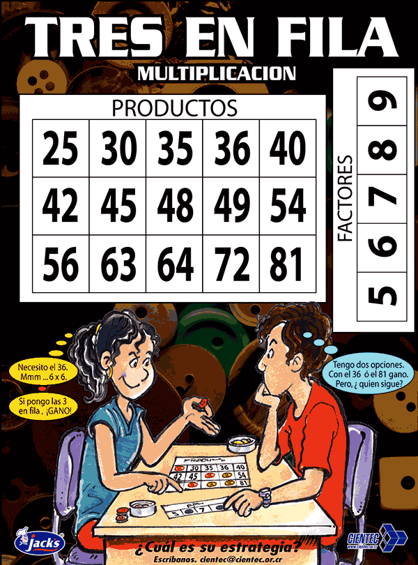 Este juego fue desarrollado conjuntamente por Margot Martínez de la Universidad Nacional y Alejandra León Castellá de CIENTEC, como parte de estrategia con cuatro productos impresos en las cajas de cereal Jack's (2006), para mostrar la matemática en contexto, de manera cotidiana, e involucrar a los usuarios en la resolución de problemas y en el juego. En los laterales de las cajas se incluyen fórmulas, recomendaciones, problemas adicionales e ilustraciones para visualizar los conceptos.