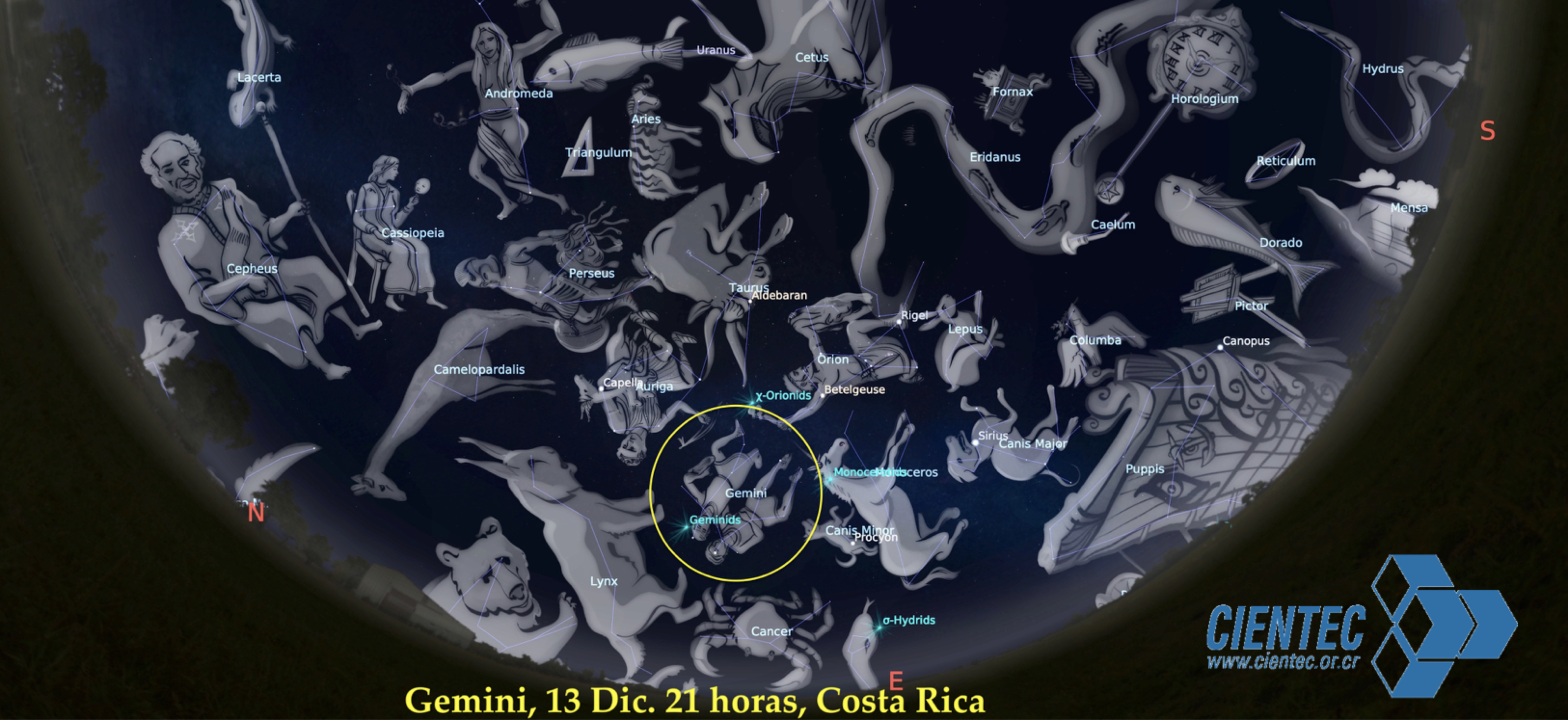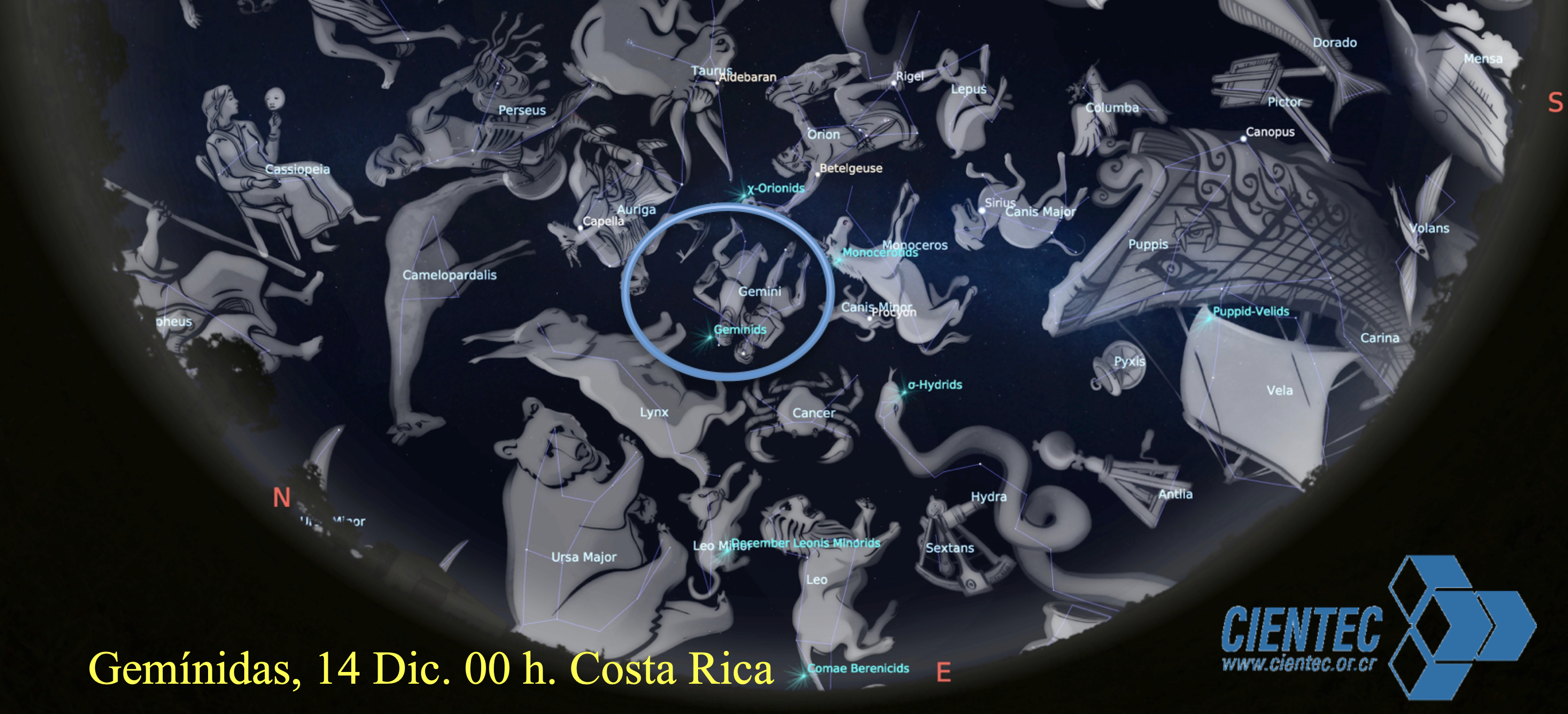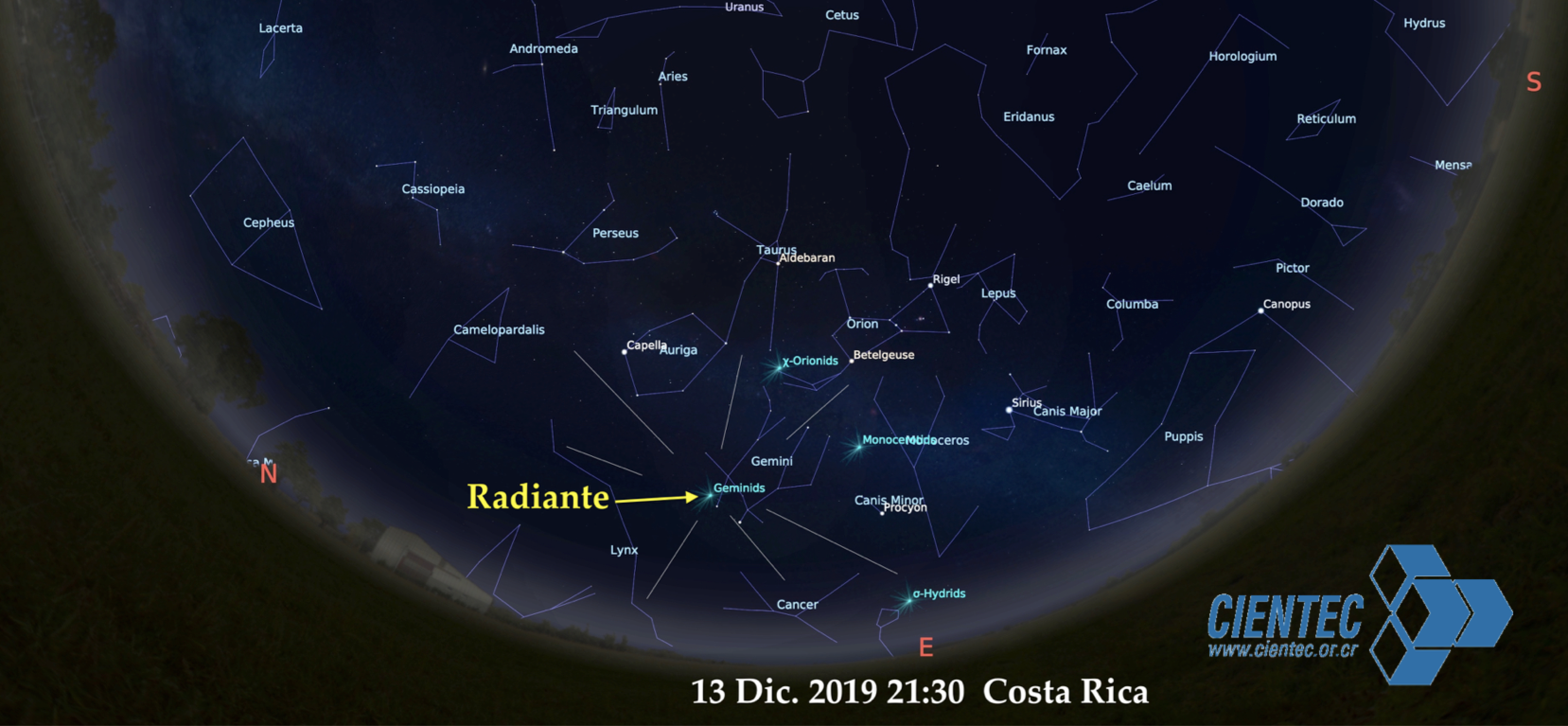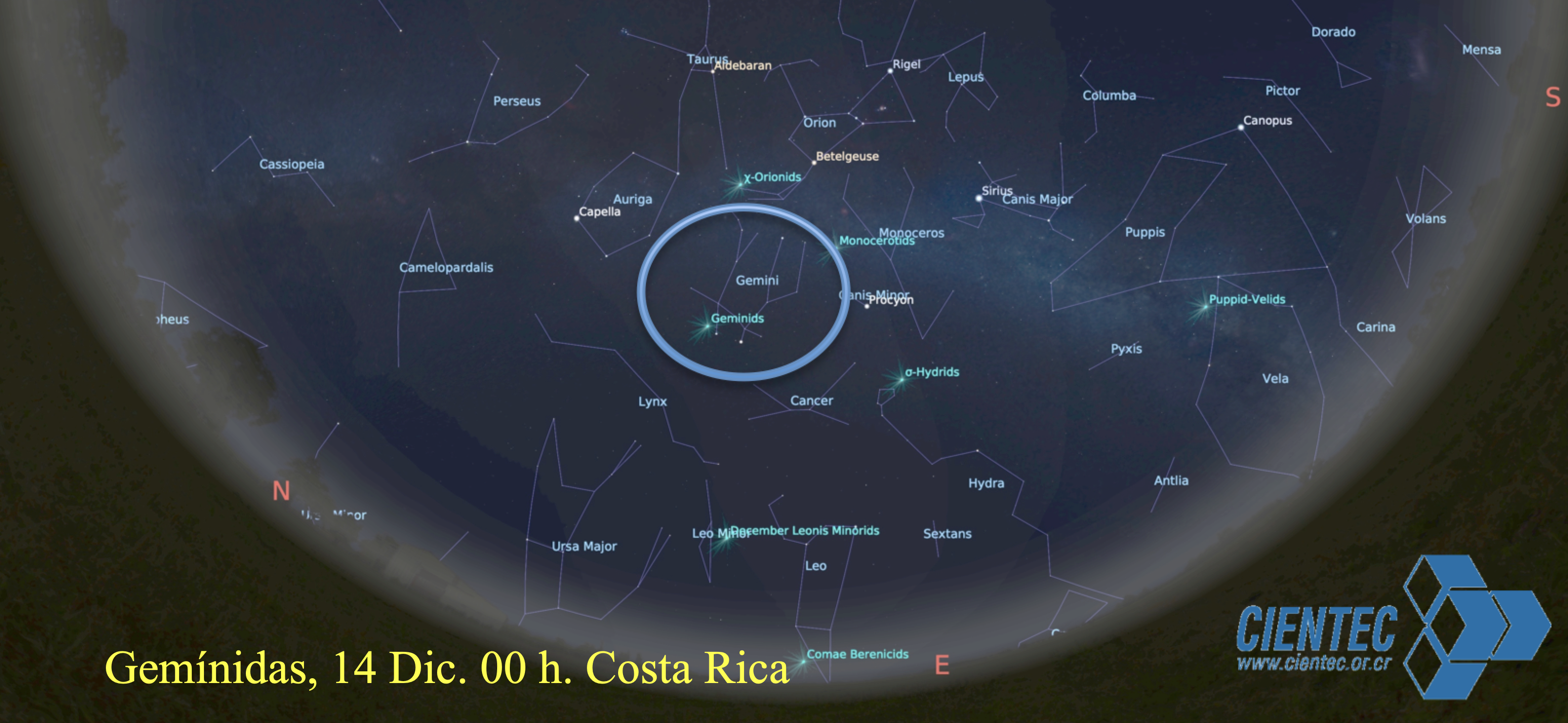 La lluvia de Gemínidas está activa desde el 4 al 17 de diciembre, con un máximo el 14 en la mañana a las 6:30 am en Costa Rica (12h 30 m UT). Se proyectan unos 120 meteoros en el máximo, en todo el cielo.