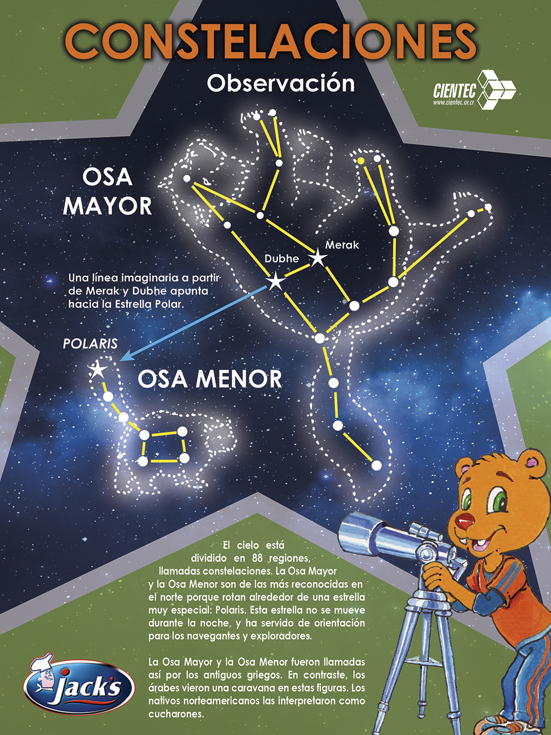 En el 2017, CIENTEC dedicó una campaña a la astronomía en las cajas de cereal Jack's, con gran distribución en Costa Rica y países vecinos. Una de las publicaciones se concentró en al mito y el movimiento de las constelaciones de la Osa Mayor y la Osa Menor. Aquí compartimos los diseños.