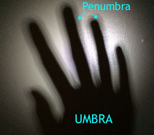 Siguen dos esquemas para entender mejor la umbra y la penumbra, sombras que podemos también producir con las manos.