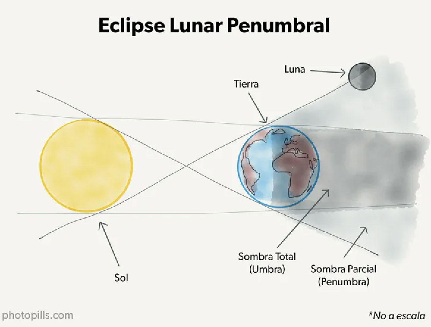 En esta ocasión, la Luna llena se meterá parcialmente en la sombra difusa de la Tierra, en un danza muy larga, de más de 4 horas y media, que inicia el domingo tarde en la noche y sigue hasta el lunes en la madrugada. Un cachito de Luna se quedará fuera de la sombra en en este eclipse.