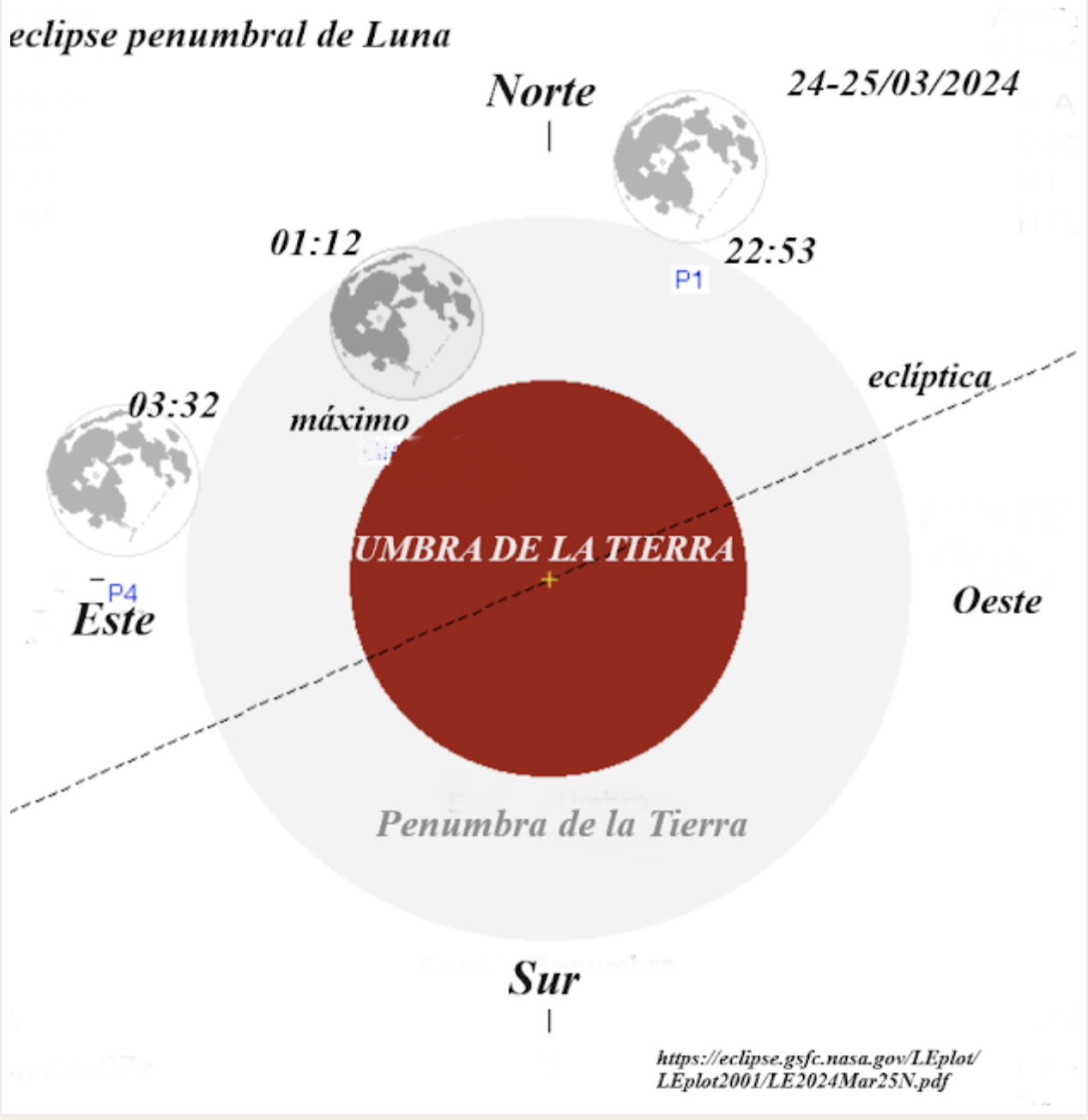 El 2024 nos dará otro Eclipse lunar el 17 de septiembre, en este caso un pequeño parcial. La Luna se meterá levemente en la umbra, la sombra oscura de la Tierra. Animación aquí.
