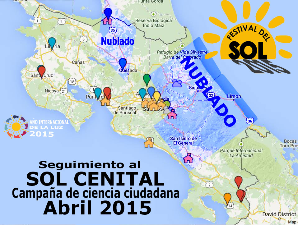 Esta actividad de "ciencia ciudadana" es organizada conjuntamente por CIENTEC, MICITT, UNED, LANOTEC, Academia Nacional de Ciencias, Instituto Meteorológico Nacional, TEC, Parque Marino del Pacífico y Museo Viajante de ciencias y matemática, como parte del “Año Internacional de la Luz 2015” y el “Festival del Sol”. A continuación, el mapa con los reportes de los participantes del seguimiento al paso del sol cenital.