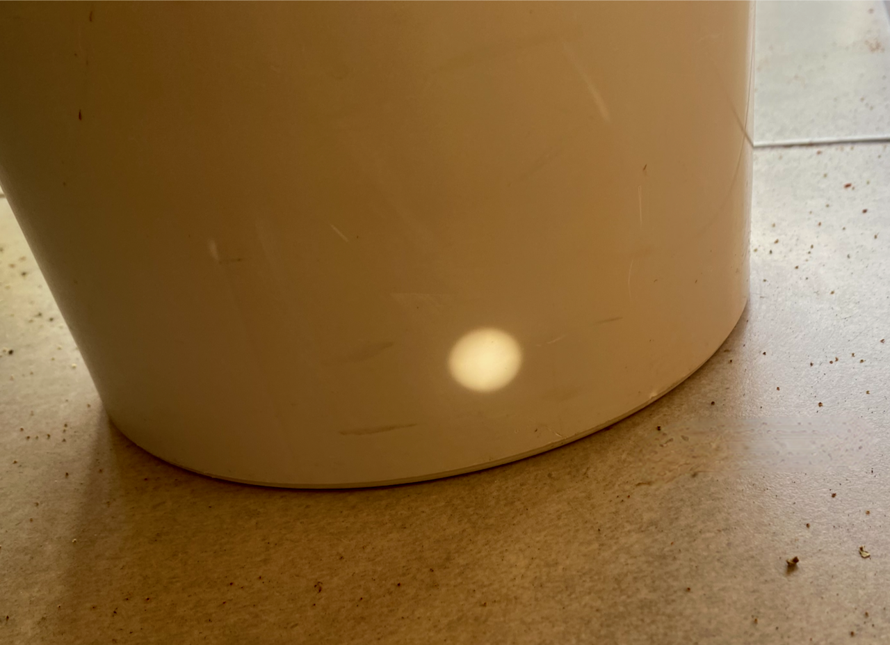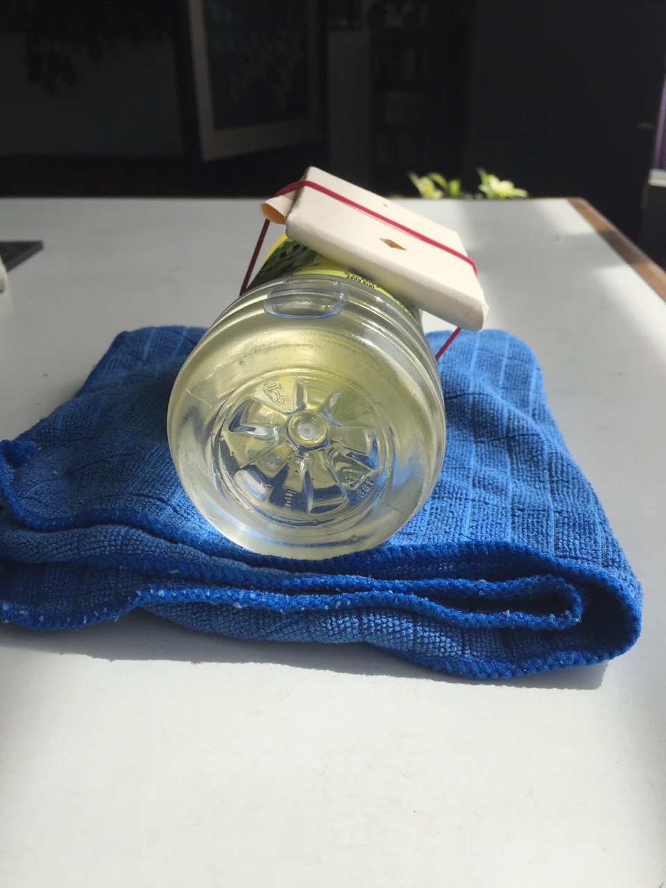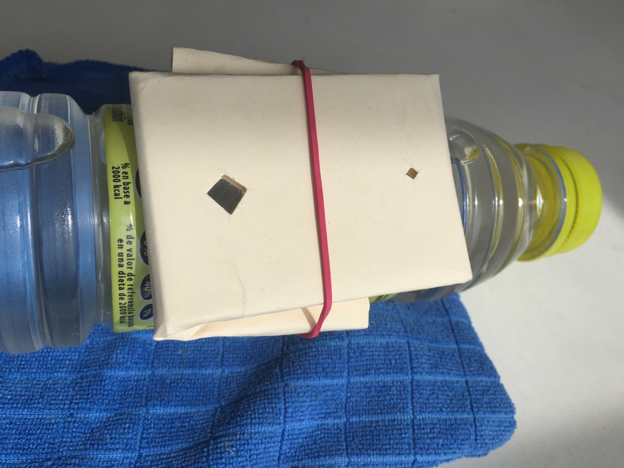 Ella pegó el espejo a la botella con cinta adhesiva. Siempre dejando un hueco rectangular. Eso permite enfocar bien y saber cuándo se tiene suficiente distancia para proyectar la FORMA de la fuente de luz, que es lo que queremos.