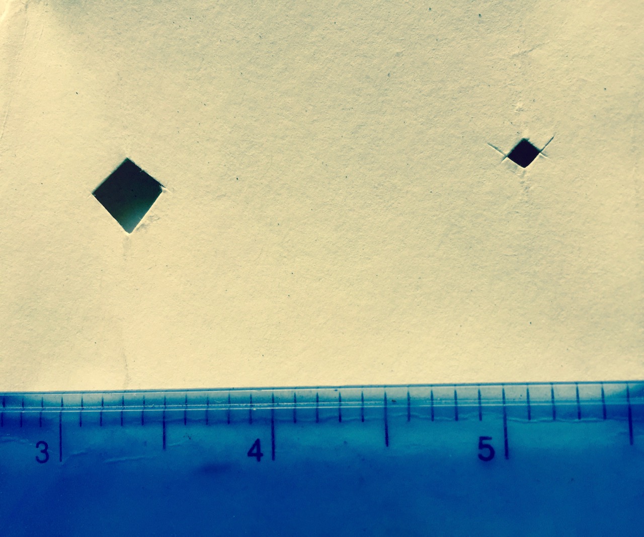 Los huecos en un sobre o una cartulina se recomiendan como pequeños rectángulos. Practicar, nuevamente, es importante. Muy pequeños no proyectan casi nada, muy grandes proyectan una imagen más difusa. Por eso buscar el tamaño ideal requiere de pruebas. En mi caso, el hueco más grande abajo funcionó bien. El más pequeñito no proyectó suficiente.