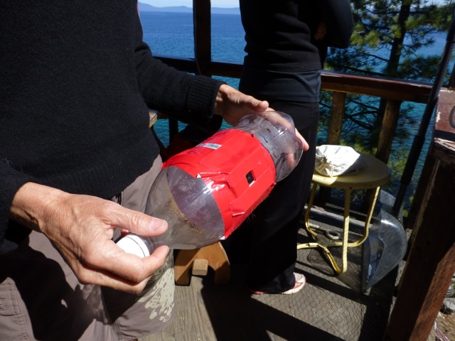 La botella es mejor que sea grande y llena de agua pesa suficiente y no la mueva el viento. (No lo sostenemos con las manos para que la imagen sea clara y no vibre.) Se fija la posición de la botella para que no ruede y para darle la dirección deseada. Puede fijarse con un paño, piedras o inclusive plasticina. La posición de la botella se necesita PRACTICAR previo al Eclipse y necesitará rotarse un poco durante el largo período. Deben tomar en cuenta la inclinación del Sol durante este eclipse de agosto 2017, que empezará cerca del medio día y termina pasadas las 2 de la tarde (12:04- 14:22 para Costa Rica).