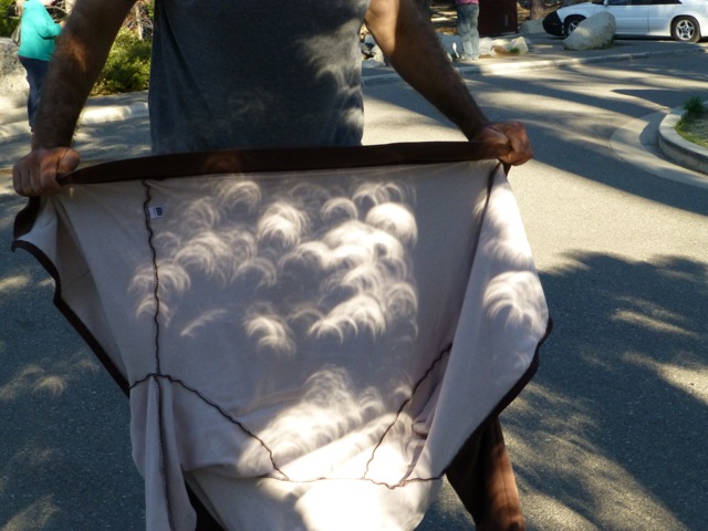 La proyección del Sol se da naturalmente a través de pequeños agujeros entre las ramas de los árboles. Esta imagen es en EE.UU. tomada durante el Eclipse Anular del 2012 por la autora. Observe las imágenes del Sol eclipsado proyectadas en el suelo y en la ropa.