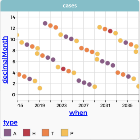 Aquí hay un enlace a un documento en CODAP con los datos de eclipses solares. Si observa la brecha verá que es aproximadamente 180 días entre eclipses.