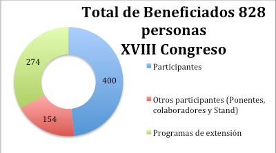 Específicamente, los beneficios directos y presenciales del congreso llegaron a 828 personas, entre los cuales se encuentran 400 participantes inscritos, 93 ponentes, 35 miembros del comité organizador y apoyo técnico, 26 presentadores en Stand y 274 participantes en los programas de extensión pre-congreso.
